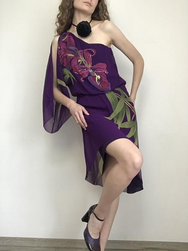 100% шовк. сукня на літо фіолетового кольору з квітами асиметрична