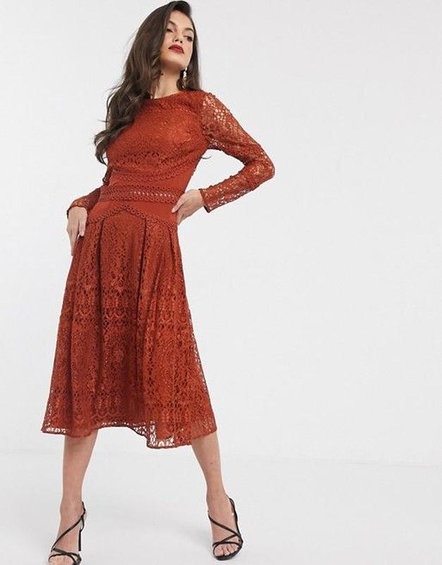 Платье гипюровое длинное кружное ажурное с рукавами пышная юбка миди ретро для фотосессии женская./ASOS. 47% Polyamide. 41% Viscose. 12% Cotton. 100% Polyester. Цвет - темный оранжевый (кирпичный). Оттенок чуточку темнее, +/- как на манекене в комнате (зависит от освещения/теплый/ холодный). Размер указан EUR 36./ UK 8/US4. Может быть s. Линия груди 38-46 см, расширяется. Обхват +/- 86 см. Линия талии 34 см. От пояса свободна. Длина от плеча 112 см./миди. Плечи 34 см. Длина рукава 60 см. Внутри имеет легкую длинную подкладку. Позаду прихована блискавка 55 см.