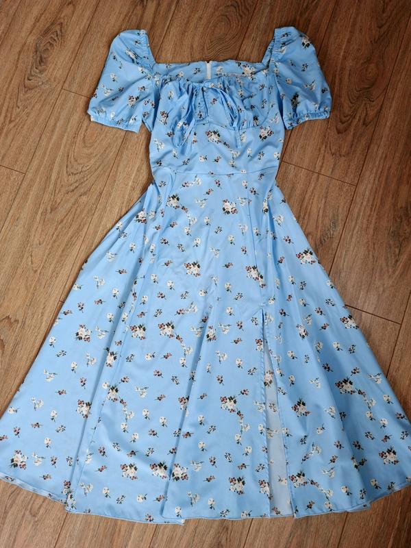 легкое и нежное платье,небесно голубого цвета, цветочный принт. разрез до колена, два кармашка, грудь на завязке регулируются(в/с), сзади скрытый замочек, ткань софт. красиво садится по фигуре. размер М, длина 116см, ширина в талии 36.5см стан. идеальный, одетая один раз.