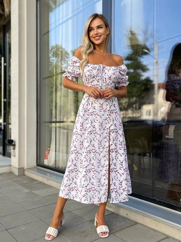 Дуже ніжна та легка літня сукня : грудь на затяжці, спинка затягується на шнурівці, маленький рукав ліхтарик на резинці , спідниця з розрізом 🌹🌺 Арт. 10486 Тнанина: шовковий софт, принтований Тканина: Туреччина дуже приємна на дотик🌹 Кольори: білий (чорна квітка), білий ( рожева -малинова квітка), білий (блакитна квітка), білий (ніжно-рожева квітка) білий (рожевий бутончик) білий (малинова гвоздика) білий (блакитний букетик) білий (малинова квітка) білий ( рожева троянда) молочний ( рожева квітка) С-М(42-44) Об. гр. до 92 см. Об.талії до 70 см Довжина сукні 123 см. М-Л(46-48) Об. гр. до 100 см. Об. таліі до 80 см. Довжина сукні 124 см.