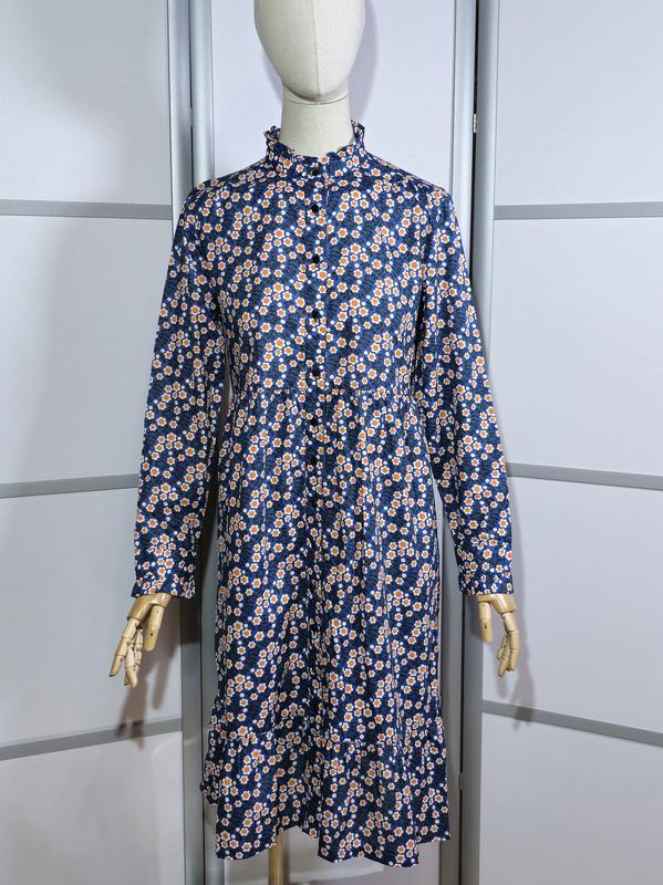 REGATA коттоновое синее платье меди в цветочный принт Застегивается на пуговицы, длинные рукава на манжетах, отрезная талия, по юбке оборка бавовна! Бирка со составом срезанная.. Идеальное состояние Размер UK14 длина от плеча -105 от плеча до талии-37 полу охват груди -51 талии-49 полуобхват бедер-68 плечо-12 рукав-60 ширина в плечах-42 полуобхват в бицепсе -20 Застегивается на пуговицы, длинные рукава на манжетах, отрезная талия, по юбке оборка бавовна! Бирка со составом срезанная..