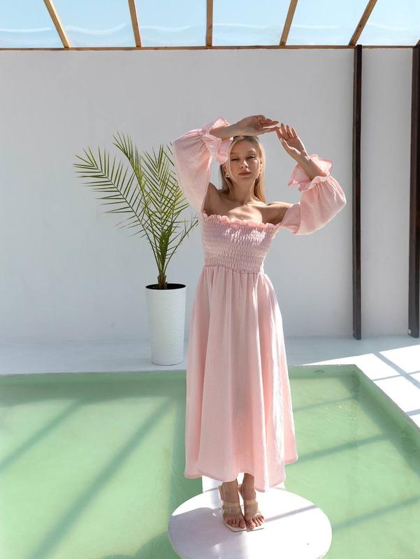 Жіноча літня рожева сукня міді з довгим рукавом однотонна муслін