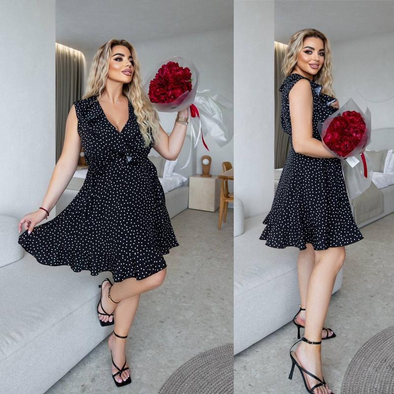 Стильна сукня на запах🌸🌸 #1347 Розміри 48-50,52-54,56-58,60-62 Кольори👉 чорний, блакитний та червоний Тканина👉 софт принт горох приємний до тіла Заміри: груди талію стегна 48-50 106(до 116 груди) 90 Кліш бедра 52-54. 114(до 127 груди) 96. Кліш бедра 56-58. 126 (до 135 см груди) 118. Кліш бедра 60-62 135-145 Ог кліш бедра Запах зручно регулювати‼️ Довжина 48-50 -92 см, 52-54 -96 см, 56-58 - 100 см 60-62 102 см На моделі 48-50 розмір Параметри 110 86 112