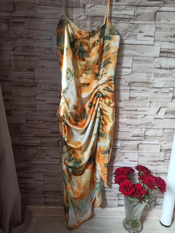 Платье летнее сатиновое, принт абстракция, очень красиво сидит на фигуре, красиво декорирована юбка с разрезом и складками