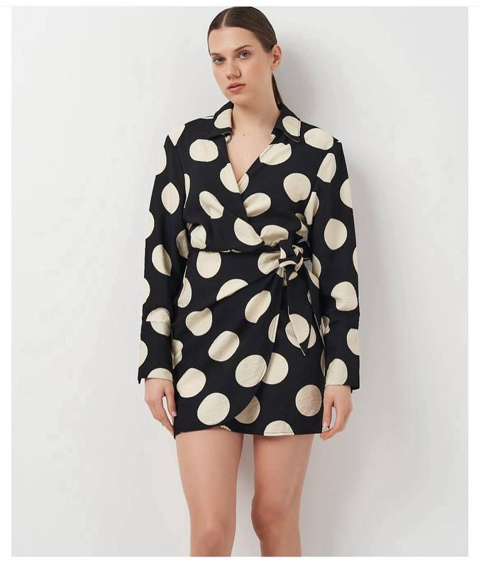 Короткое платье из вискозы с воротником и запахом спереди с широкими завязками сбоку. Заниженная линия плеча, длинные рукава и широкие манжеты.