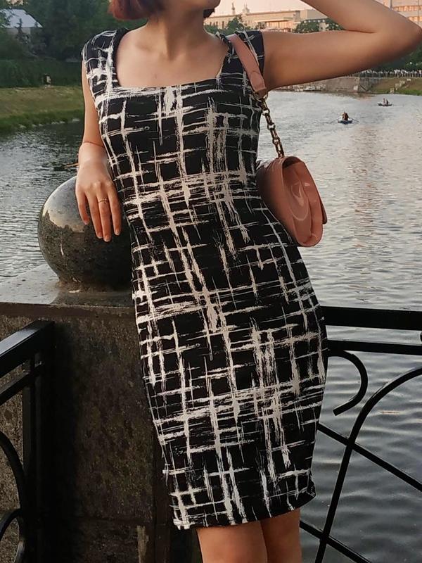 Чорно-біла сукня міді з квадратним вирізом та геометричним принтом