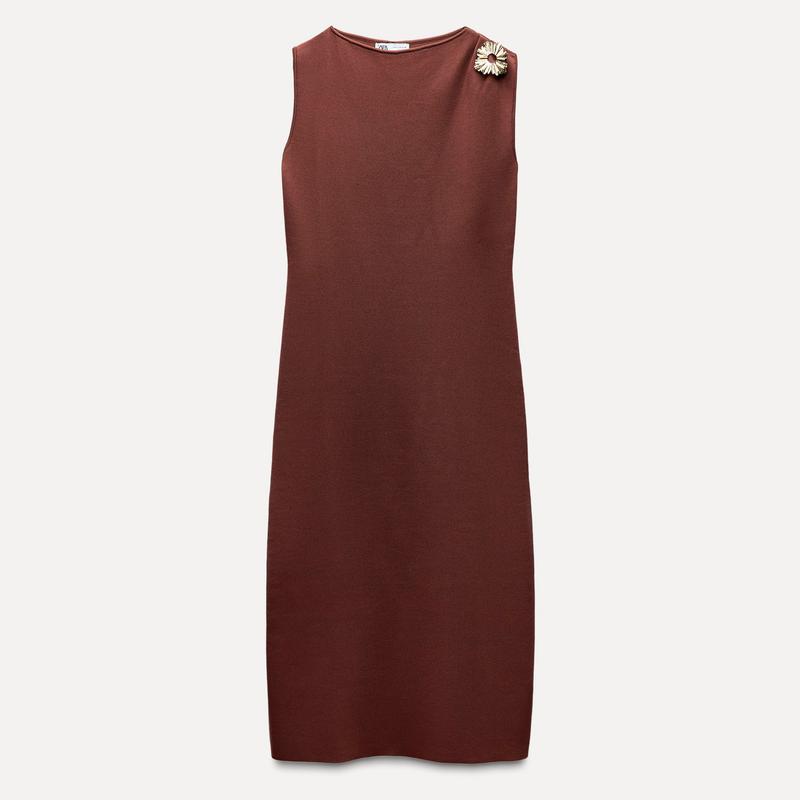 Новое коричневое прямое платье миди с металлическим декором на плече zara