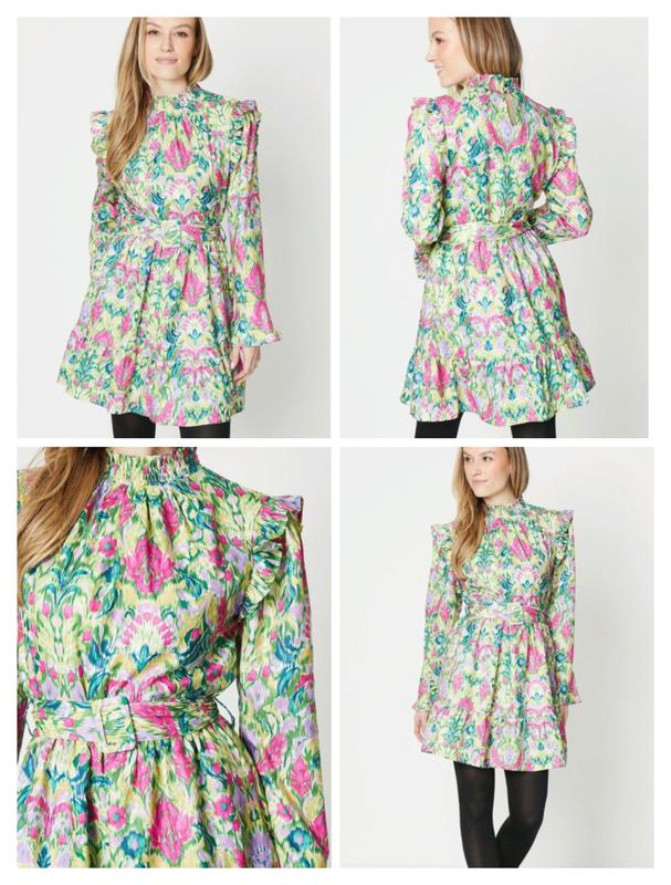 Платье с красивыми оборками на шее и руках Есть молния сбоку, петли для пояса, пояс. Две пуговицы на шее, запасной Тканина не тягнеться. По всей длине платья кроме рукавов есть подкладка зеленого цвета На бирке указан размер 14/42/10 Ориентировочно размер L, возможно XL Замеры: длина 92, под руками 49, пояс 43 Первая фотография в объявлении - из интернета, остальные Мои