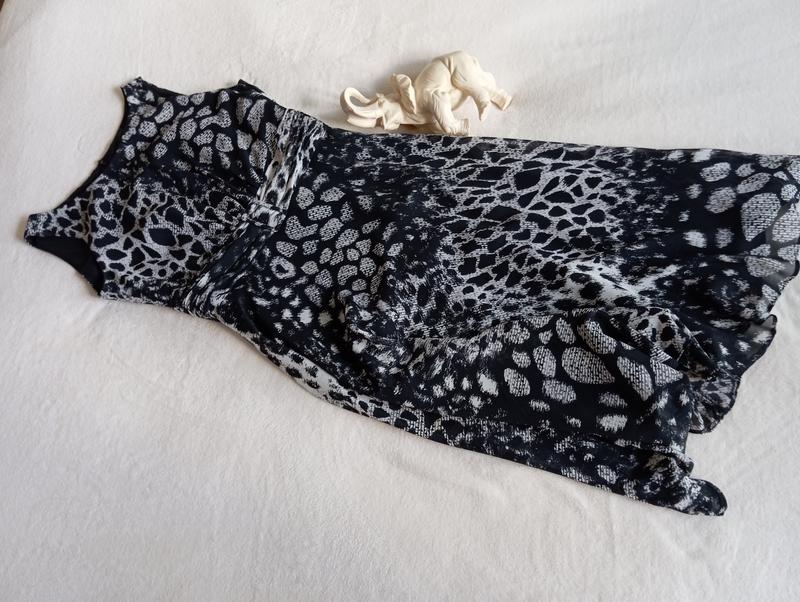 Красивое платье миди у лео принт без рукавов от Wallis. Супер качество. Цвет черный и свет серый. Ткань приятная на ощупь. С подкладкой. Идеальное состояние. Без нюансов. Плечи: 33,5 Пог: 46 Пот: 36 Пос: 54,5 (подкладка) Длина: 110