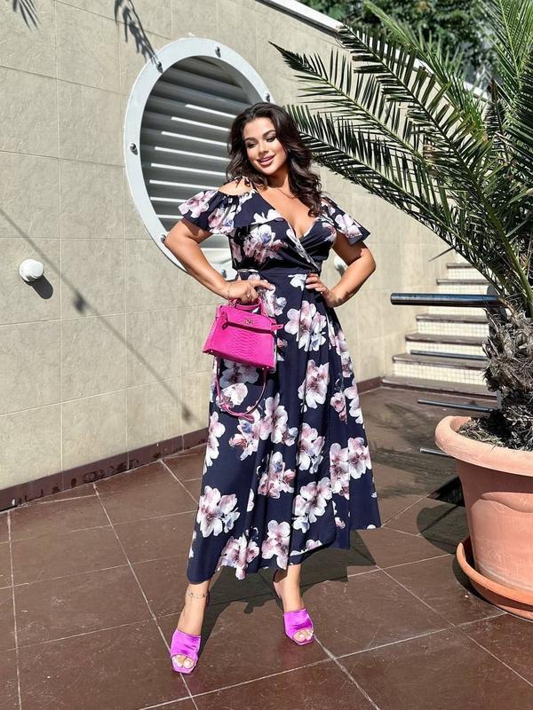 СУКНЯ НА ЗАПАХ Модель 1119 Легка вишукана сукня довжина макси Фасон «На запах», спідниця клёш Тонкі бретелі на зав'язках, з відкритими плечима та рукавами-крильцями на гумці Тканина: софт 1 розмір 48-54 довжина виробу від бретель 140 см ОГ від 100до 116 2 розмір 56-62 ОГ від 118 до 128