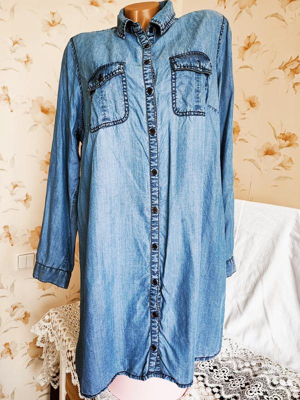 Лёгкое брендовое платье-рубашка деним. Небольшой отложной воротник рубашечного типа. Спереди застёгивается на мелкие пуговицы. По спинке немного удлиненное. По бокам разрезы. Два нагрудных кармана на пуговицах. Длинный прямой рукав на манжете, укорачивается с помощью пуговицы. Есть хлястик для пояса. Состояние идеальное. Дефектов нет.