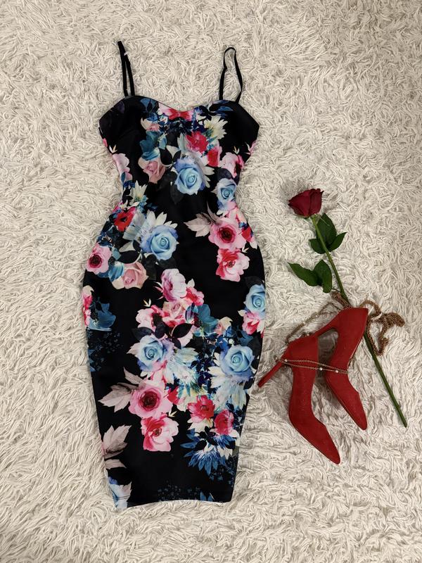 Спокуслива сукня в квіти. Заміри на фото. Маленький нюанс- затяжка. На фото видно. На тілі не помітно. Тканина - типу дайвінг, плотна, приховує всі недоліки.