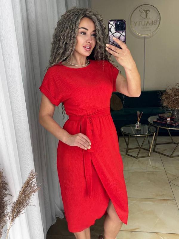 Сукня жіноча базова міді на короткий рукав літня плаття з поясом бежеве чорне червоне блак...