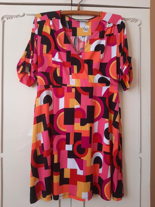 Новое летнее платье, полиэстр, отрезное по талии, талия на резинке, грудинка " на запах", юбка полусолнце. Размер 18(2 XL), полуобъем груди 56, талии 49, бедер 62, длина 96.