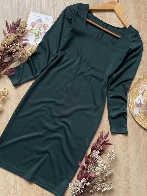 Класична сукня міді глибокого зеленого кольору, смарагд Приємна тепла тканина, гарно тягнеться і сідає по фігурі, підійде на осінь-зиму Має красиве пів-квадратне декольте На розмір xs-s Заміри: пог 39 пот 33 поб 41 довжина 94 рукав 59