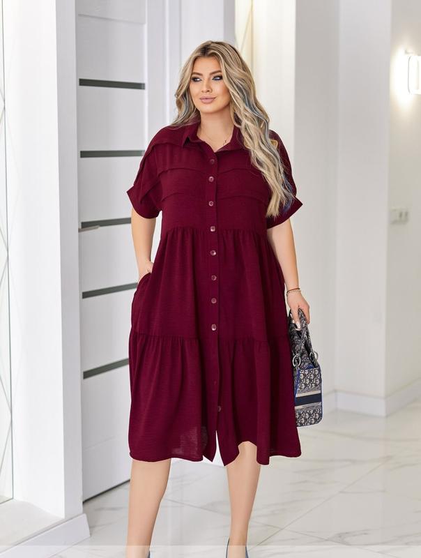 Фабричное качество🔝 Однотонное платье на пуговицах. ✔ Длина: миди ✔ Свободный верх с изящной драпировкой плавно переходит в широкую юбку, что подчеркивает легкость образа. ✔ Аккуратный воротник рубашечного типа. ✔ Застежка на пуговицы добавляют нотку классики. ✔Широкие рукава-летучие мыши грациозно формируют силуэт, создавая эффектную игру объемов. ✅ Комплектация: платье. ✅Материал: американский креп 📍 Замеры по готовому изделию : 📐Size 50/52 : длина платья 108см, длина рукава от горловины 37см, обхват рукава 52-38см, ОГ - 104см, ОТ -98см, ОБ -140см. 📐Size 54/56 : длина платья 108см, длина рукава от горловины 38см, обхват рукава 54-40см, ОГ - 112см, ОТ -106см, ОБ -156см. 📐Size 58/60 :длина платья 108см, длина рукава от горловины 40см, обхват рукава 54-42см, ОГ - 120см, ОТ -116см, ОБ -170см. 📐Size 62/64 : длина платья 108см, длина рукава от горловины 40см, обхват рукава 60-44см, ОГ - 130см, ОТ -124см, ОБ -180см. *Растяжимость: слабая (0-1см) *Замеры могут отличаться от указанных на +-2см в зависимости от особенностей ткани, техническим особенностям пошива, степенью усадки ткани ✅ Color: Голубой, Лайм, Оливковый, Электрик, Изумруд, Бургунди *В зависимости от настроек яркости, контрастности , насыщенности вашего монитора, оттенок изделия на видео и фото может немного отличаться. *При разном освещении некоторые цвета могут менять оттенок при дневном освещении на улице и в помещении при искусственном освещении. ✅ Рекомендации по уходу: деликатная стирка **В зависимости от цветопередачи Вашего монитора, оттенок изделия может немного отличаться ***В зависимости от партии фурнитура в изделии может меняться ✅ Наложенный платеж с предоплатой ✅ Отправка Новой Почтой ✅ Возврат / Обмен согласно Закону Украины "О защите прав потребителя" ✅ Фабричное производство, официальная торговая марка