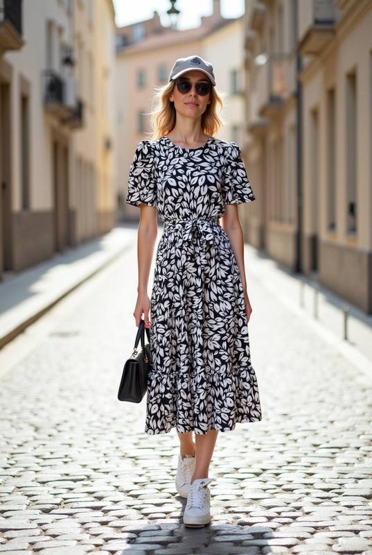 Платье женское Мод 331 311 Тканина: софт Размеры: 42–44, 46-48, 50-52 Платье миди с цветочным принтом Стильное черное платье с белым абстрактным принтом - сочетание классики и комфорта. • Модель миди из легкой ткани. • Рукав - укороченный, слегка объемный. • Талия подчеркнута поясом из того же материала. • Юбка - многоярусная, с легкой волной при движении. • Идеально подходит как для городского образа, так и на отдых. Размер по сетке: • 42–44: грудь 90 см / талия 60–70 см / рукав 34 см / длина 118 см • 46–48: грудь 98 см / талия 66–76 см / рукав 35 см / длина 119 см • 50–52: грудь 106 см / талия 72–82 см / рукав 36 см / длина 120 см