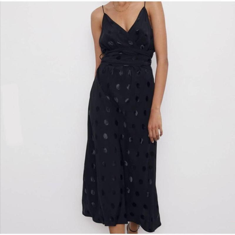 Платье Zara, миди, Черное в горошек. Имеет пристроченный по бокам пояс, который можно завязать спереди или сзади, как бант. Супершелковистый материал отлично подходит для повседневного дня или вечернего выхода. Состав: 100% вискоза.