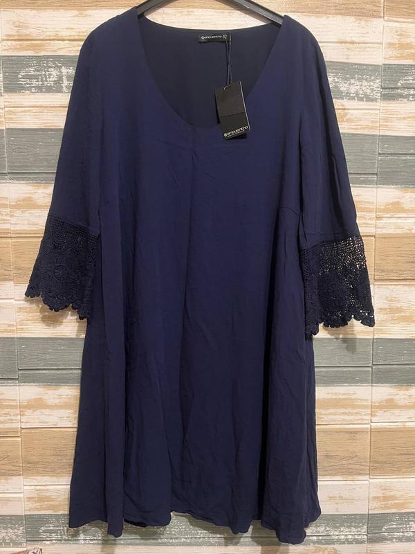 Сукня нова з біркою, темно-синього кольору,на підкладці, рукава 3/4 з мереживом. Розмір EU 42, UK 46-48 Склад коттон Пог 50 см Поб до 64 см Довжина 92 см Рукав від плеча 50 см