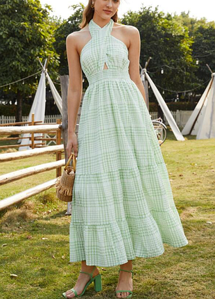Очень красивое платье-миди Размер заявлен 44(на наш 50/52) ПОГ 52 ( замер примерный, так как можно регулировать с помощью завязок) ПОТ 40+(тянется за счёт резинок) Ширина пояса 5 см Длина от пояса до низа юбки 99 Длина платья 138