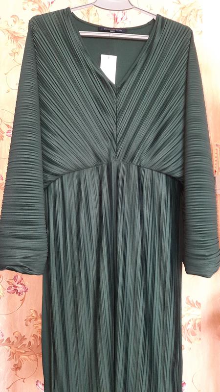 Платье оригинального кроя, гофре. Цвет насыщенный изумруд, фото не передает оттенок. р.L или 14UK. Ди 110 см, ПОТ 42 см. Пояс в комплекте. Любые необходимые замеры и дополнительные фото по запросу.