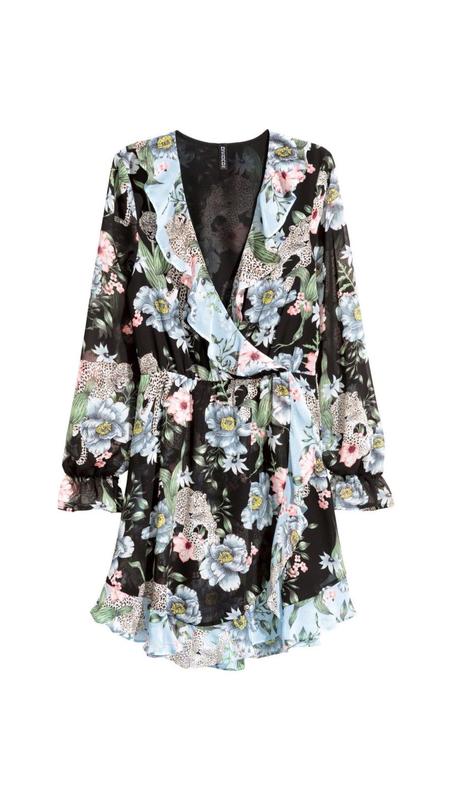 Чорна в тропічний принт міді сукня H&M Розмір вказаний 42. Ширина плечей 39 см Ширина грудей напівобхват 48-50 см Талія на резинці, напівобхват 36 см, тягнеться до 44 см Стегна напівобхват 62 см Довжина рукава від плеча 64 см Довжина по спині 90 см Склад: поліестер
