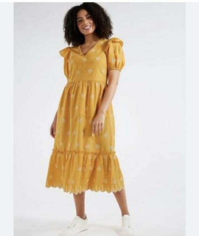 F&F новое платье миди из прошвы желтого цвета 100% бавовна На подкладке По спине на молнии Размер указанный 18( наш 52 -54) Замеры Пог 55 пот 48 поб 63 длина 122 длина от плеча до талии 44