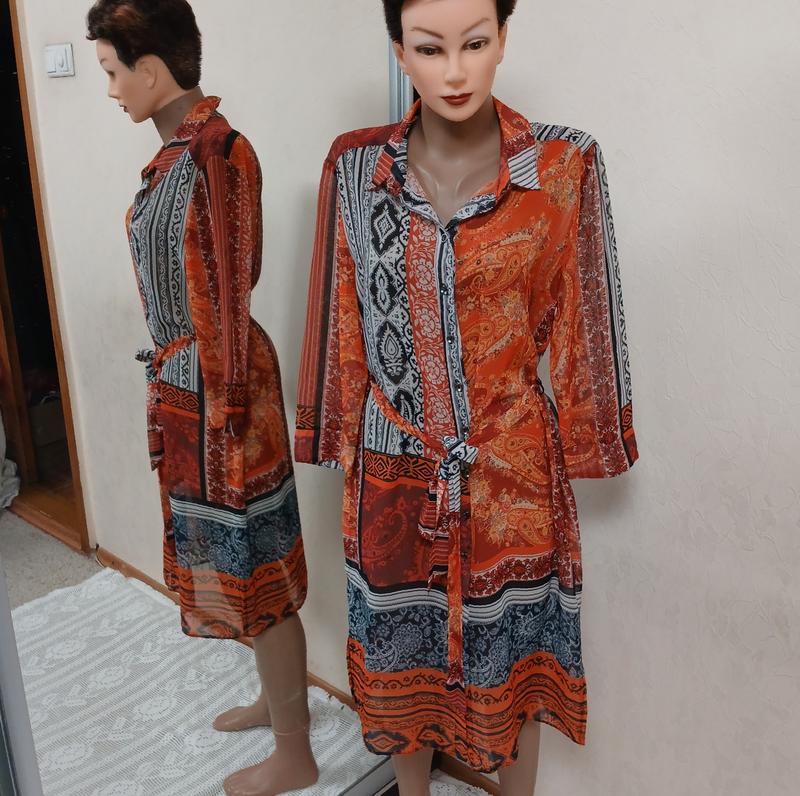 Платье- халат брендовое,с длинными рукавами, с боковыми разрезами длиной 14 см.Вымеры изделия: пог 54 см,пот 51 см, попостонка:56 см., длина изделия: 105 см, длина рукава:47 см.