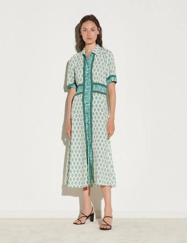 Sandro SFPRO01205 Женское платье Sandro. Длинное платье-рубашка из льна с принтом. Воротник рубашки. Короткие рукава с манжетами. Инкрустированный пояс. Лиф по фигуре и расклешенная юбка с разрезом. Застежка спереди на декоративные пуговицы. 88% вискоза, 12% лён Дополнительная ткань 88% вискоза, 12% лён 7600035812833