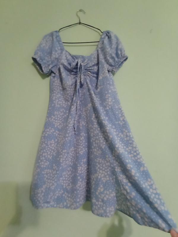 платье женское голубого цвета принт: белые цветочки на бирке написан размер s, но подойдет больше на м. Надевала всего 1 раз. Очень стильная и легкая ткань, идеально подойдет на лето 2025