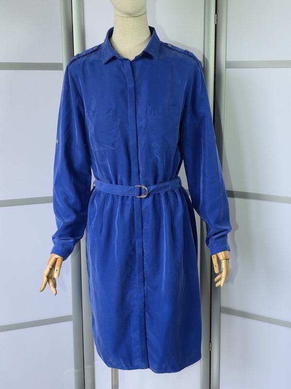 TALLINDER насыщенно-синее платье прямого силуэта, съемный пояс Застегивается на пуговицы скрытые планкой, карманы на груди 70% модал (вискоза), 30% полиэстер, качественная ткань, похожая на тяжелый шелк, очень приятная к телу Идеальное состояние Размер EUR 42 длина от плеча -105 полу охват груди -58 талии-57 полу охват бедер-63 плече-13 рукав-62 ширина в плечах-43 полу охват в бицепсе -19