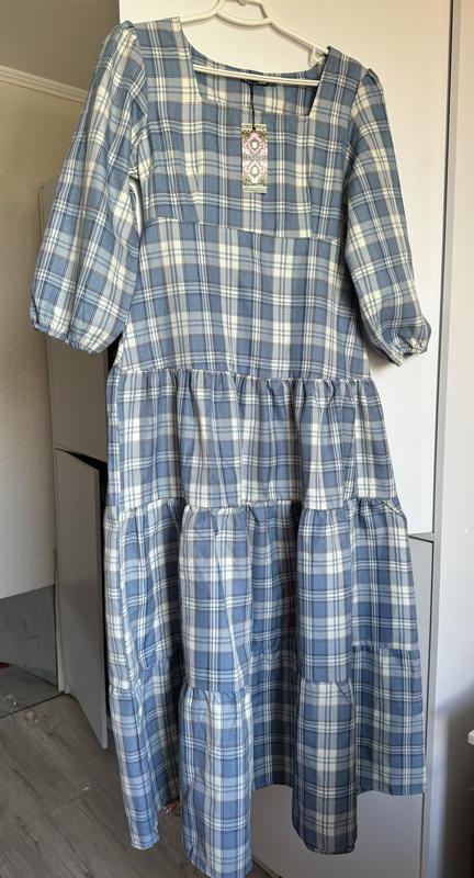 Сукня в клітинку з квадратним вирізом, пишним рукавом, верх приталений в поясі -70 см, до низу пишна , обʼєм в грудях -90см. Продаю бо не влізла саме в обʼємі грудей. РощмвриС-М