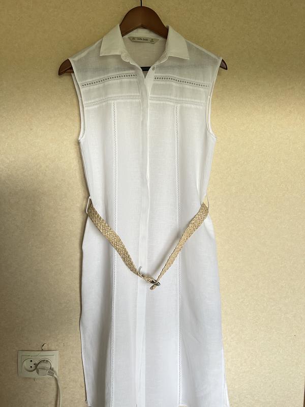 Біла літня сукня декорована мережкою та ремінцем (плетена соломка) від ZARA; в складі тканини 53%~льон та 47%~бавовна; потайна застібка, ґудзики з натурального перламутру, з боків неглибокі розрізи. Стан ідеальний, без нюансів. Розмір XS(S)
