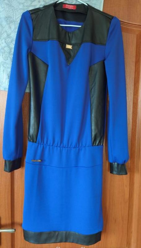 Плаття жіночі з вставками кожзам. Нове. Заміри зроблю по запиту. Звертайтеся за інформацією. Пропоную вишукану сукню насиченого королівського синього кольору, яка стане чудовим вибором для офісу, святкових подій або вечірнього виходу. Модель вирізняється сучасним кроєм та стильним оздобленням. Ключові особливості: Матеріал: Якісний трикотаж, який гарно тримає форму, у поєднанні зі вставками з м'якої чорної екошкіри. Дизайн: Контрастні вставки на плечах, манжетах та по низу виробу додають образу особливого характеру. V-подібний елемент на грудях візуально витягує силует. Фасон: Приталений крій із акцентом на талії (злегка занижена лінія талії) та довгі рукави з шкіряними манжетами. Деталі: Наявна невелика золотиста фурнітура (логотип або декоративний елемент) на талії. Сукня виглядає дуже жіночно та стильно, підкреслюючи фігуру та додаючи впевненості. #сукня #синясукня #сукнязекошкірою #жіночийодяг #діловасукня #вечірнясукня #сукняукраїна #моднасукня #shafa #одягдляжінок