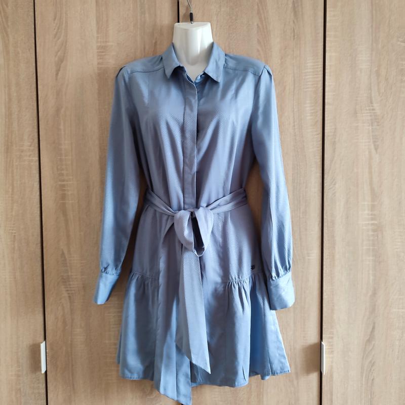 плечо 38см грудь пояс бедер50см, длина 90см есть поясок можно носить без пояса,застежка по длине на пуговицу состояние новой вещи