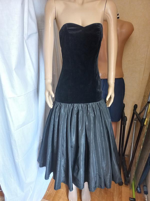 Винтажное бальное платье из черного бархата и тафты, облегающее, с косточками, без бретелей, с лифом типа "рыбий хвост". Большой бант на спине, около 1989 года выпуска. Сетка под тафтой. В отличном состоянии.
