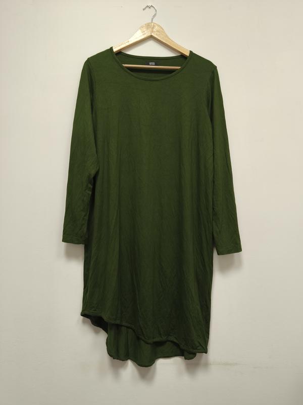 платье туника свободного кроя с асимметричным подолом. Припыленный глубокий зеленый цвет (спереди однотонный, сзади- с принтом в вертикальных мазках) типичный японский арт дизайн, минимализм с элементами ручной работы. плечи-40 см пог-56 см длина -92/101 см рукав-61 см