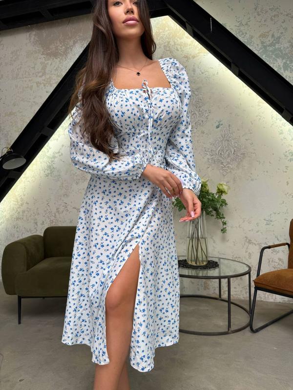 Женское летнее платье миди с разрезом на ноге с длинными рукавами в цветочный принт