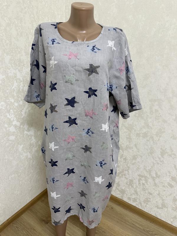 Прекрасна лляна сукня в принт зірки .Вільна ,бохо, оверсайз.Є кишені . Виміри: ПП 40 ПГ 59 ПТ 63 ПС 73 Низ 72 Довжина 102 Рукав 35
