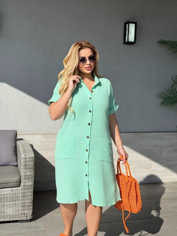 ✅мод.304 ✅Повседневное нежное женское платье-рубашка из муслина. Платье-рубашка подходит женщинам любого возраста: молодым девушкам оно станет незаменимой вещью базового гардероба, а женщинам постарше позволит выглядеть моложе. ✅Размер:48-50,52-54,56-58 ✅Ткань:Муслин.Очень легкая, натуральная, приятная на ощупь ткань. Особенность его в том, что муслин бывает лишь натуральным, без синтетических волокон.Ткань очень быстро высыхает. Муслин отлично пропускает воздух, поэтому у платья из такой ткани никакой жара не страшна. ✅Уход:Птирать при температуре не выше 400.Изделия из муслина следует гладить с применением пара. ✅Цвет: мятный,лаванда,трава,джинс,Мокко,серый,черный. ✅48-50 О.Г-116.,О.Б-126.,длина-105. ✅52-54 О.Г-124.,О.Б-134.,длина-105 ✅56-58 О.Г-132.,О.Б-142. длина -107