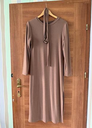 Трикотажна сукня в ідеальному стані приємного колір у пудра. Довжина міді нижче коліна з бічним розрізом. Загальна довжина від плеча 121 см. ПО талії 40 см. Можна носити з поясом на талії
