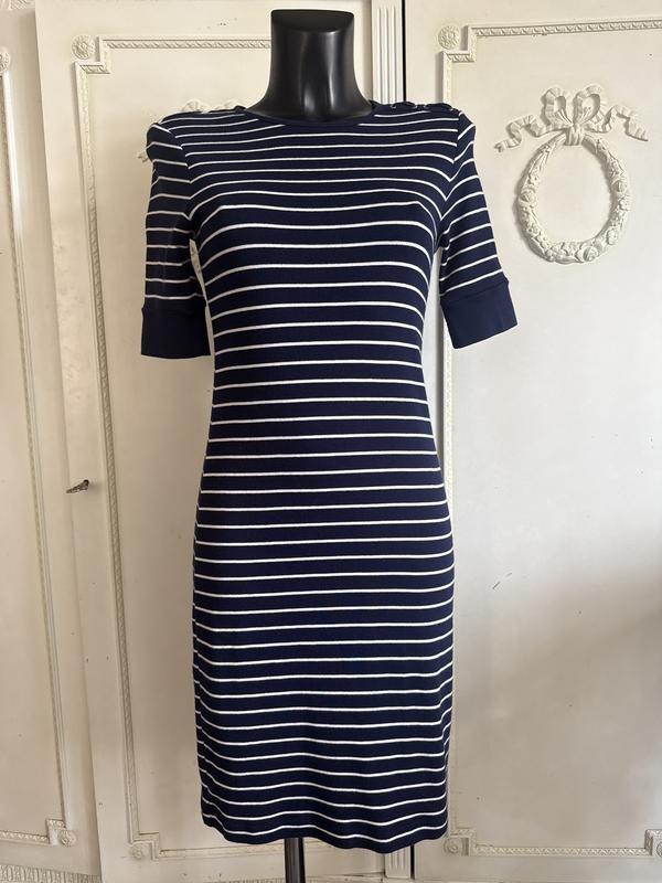 Якісна трикотажна сукня . Темно-синій колір в білу смужку. Склад:кртон-100/. Розмір по бірці-XS. Заміри: довжина-95 см, ПОГ-38 см, ПОБ-40 см. Трикотажне полотно щільне, добре тримає форму.