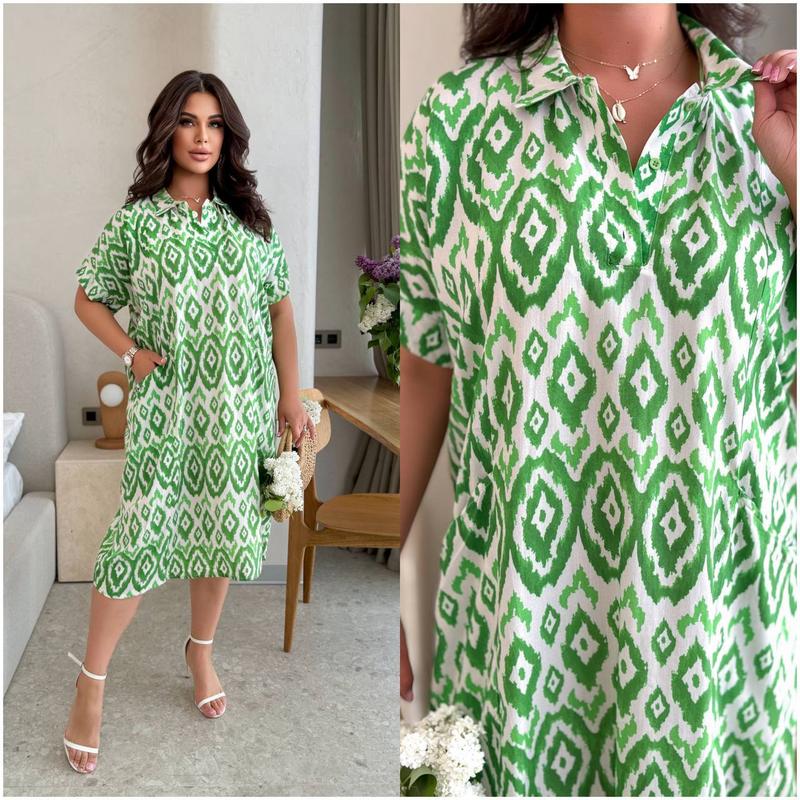 Мод. 5211malex Ткань: штапель 100% хлопок (вир-во Турция) Размеры: 48-52, 54-58 Цвета: зеленый, электрик, малина, черный 📌Замеры по изделию. Тканина не тягнеться: 48-52 ог - 124 см, длина - 111 см 54-58 ог - 134 см, длина - 112 см Для комфорта разница 6-8 см Летнее платье прямого силуэта. Модель имеет отложной воротник и застегивается спереди на пуговицы, что добавляет образу изысканности. Короткие рукава и длина до колена создают комфортный и легкий силуэт. Платье выполнено из легкой, приятной к телу ткани, идеально подходящей для теплого времени года. Дополнена накладными карманами, которые подчеркивают стиль и практичность модели. Отличный выбор для ежедневного образа, прогулок или отдыха.
