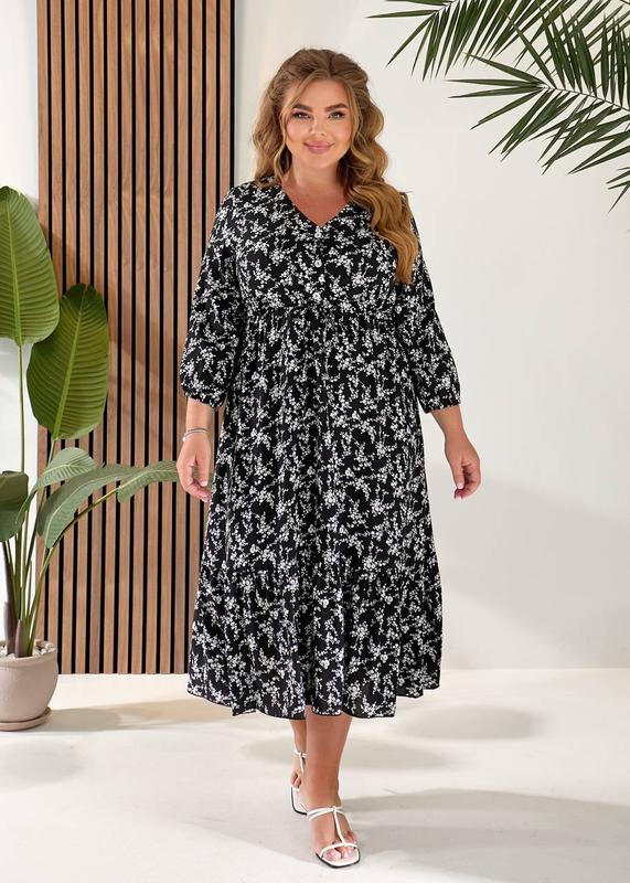 Платье из штапеля с завышенной талией Модель: 25032nob Размеры: 42-44, 46-48, 50-52, 54-56 Платье трапецивидного кроя с завышенной талией на кулиске, пуговицы рабочие, рукав 3/4 на резинке. Тканина : штапель принтований Кольори: • черный • молочный • моко ❗️Замеры❗️ Объем груди 98, 106, 114, 120 Объем бёдер: свободный Длина рукава: 48, 49, 50, 51 Длина изделия : 112, 114, 116, 118