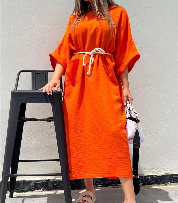 Сукня oversize з канатом (йде у комплекті) 🇺🇦Кольори: зелене яблуко, беж, малина, чорний, темно-зелений, помаранчевий, темно-синій Довга лляна сукня в стилі оверсайз — ідеальний вибір для тих, хто цінує комфорт, природність і стиль. Модель виконана з натуральної тканини, що дозволяє шкірі дихати і забезпечує легкість у спекотну погоду. Вільний крій під шнурок м’яко огортає фігуру, не обтягує, а навпаки — візуально витягує силует і робить його стрункішим. 👘Сукня чудово підходить для жінок з фігурою плюс-сайз: вона вдало підкреслює переваги та приховує недоліки. Стриманий дизайн легко комбінується з аксесуарами, взуттям та сумками — як для повсякденного, так і для святкового образу. ➡️Мод: 7145 ➡️Розміри: 44-50, 52-58 ➡️Тканина: Льон Бохо (натуральна тканина) Заміри: 🔹Довжина 124см Перший розмір ОГ до 140см Другий розмір ОГ до 158см ‼️Накращі ціни, новинки, наявність (Разг 6220)‼️