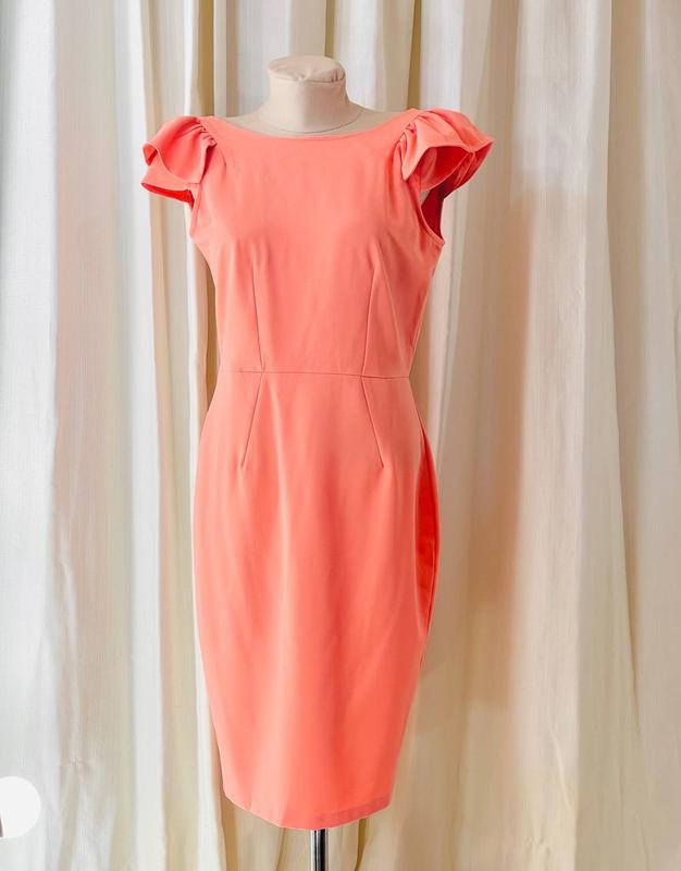 Сукня-футляр лососевого кольору CLOSET London🛍️❤️🔥 Розмір - UK 10-12/ EUR 38-40/ USA 6-8/ M / 46. Склад : 79% поліестер, 17% віскоза, 4% еластан. Виробник UK. Сукня відрізна по талії з металевою довгою змійкою на спині. Короткий рукав з воланом зверху. Круглий виріз спереду і V виріз спини. Ззаду розріз. Костюмна тканина середньої щільності. Додаткові заміри: повна довжина 100 см, довжина від лінії плеча до талії 40 см, довжина від талії вниз 60 см, ширина плечей 38 см, напівобхват грудей 46 см (повний обхват 92 см), напівобхват талії 39 см (повний обхват 78 см), напівобхват стегон 50 см (повний обхват 100 см).
