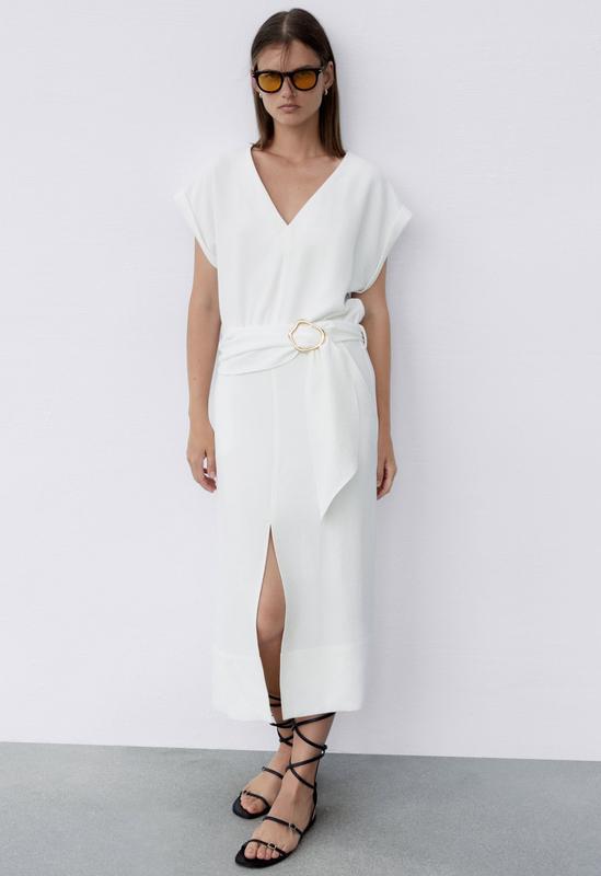 Белое миди платье от Zara. Широкий пояс с металлической пряжкой, V-образный вырез, короткие рукава, разрезом спереди на подоле, два боковых кармана и застежка на пуговицы и молнию сзади. новая с биркой Размер Л, лучше на М • короткий рукав • V-образный вырез • эластичный пояс • ремень со съемной пряжкой • спинка с замковой щелей и застежкой на кнопки • прорезные боковые карманы спереди • без подкладки Состав: 100% полиэстер ПОГ - 55см ПОТ - 36,5см ПОБ - 48см Рукав от горловины - 22см Длина - 130см