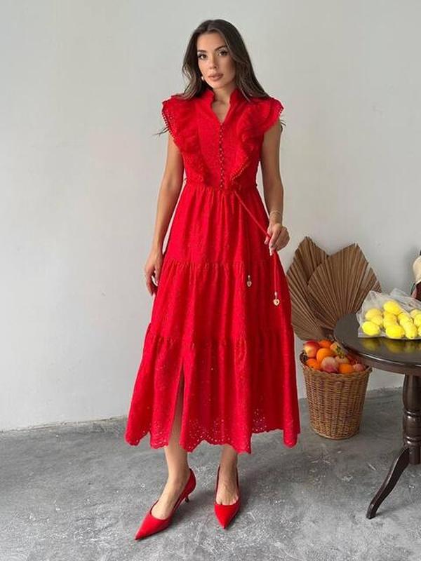 ‼️ОТПРАВЛЕНИЕ ВПРОДОВЖ 1-5 РАБОЧЫХ ДНЕЙ!!️ Платье-клеш из высококачественного турецкого материала. Модель с воротником стойка и V-образным разрезом. Декорировано двумя рюшами по полочке и сзади к отрезной талии. Подол дополнен воланом. Застегивается на пуговицы с петлями спереди. Модель на подкладке. Комплектуется поясом. Размер: 42-44, 44-46. Материал: 100% хлопок подкладка: 100% полиэстер Цвет: черный, белый, красный, зеленый, лимонный. 901376