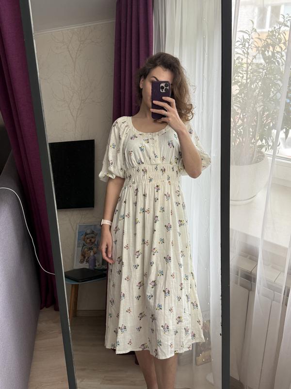Звертаю вашу увагу, що замовлення з 20 червня по 6 липня, не приймаю. Нова, неймовірно гарна сукня, в теплий квітковий принт. Натуральний склад: 65% бавовна, 35% віскоза. Сукня вільного крою, зручна, без застібок, з підкладкою. Рукава ліхтарики 3/4. По бірці розмір 12, заміри: Довжина по спинці: 116 см Пів обхват груди: 44 см (тягнеться) Пів обхват талія, по резинці: 35 см (тягнеться) Пів обхват стегон 77 см