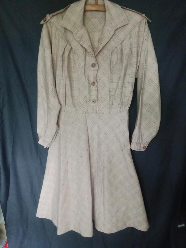платье без звезд, шилась по заказу. я пережила пуговицы на более современные, под дерево. ткань немного колючая, состав не знаю. рисунок в меланжевую клетку. замеры: ПОГ около 50, рукав летучая мышь. ПОТ 37! ВНИМАНИЕ! само узкое место в платье - талия, так как нет никаких замочков на талии, расстегиваются только пуговицы до пояса. ПОБ свободно. длина по спинке до пояса 42, от пояса книзу 63. полная длина 105 см.